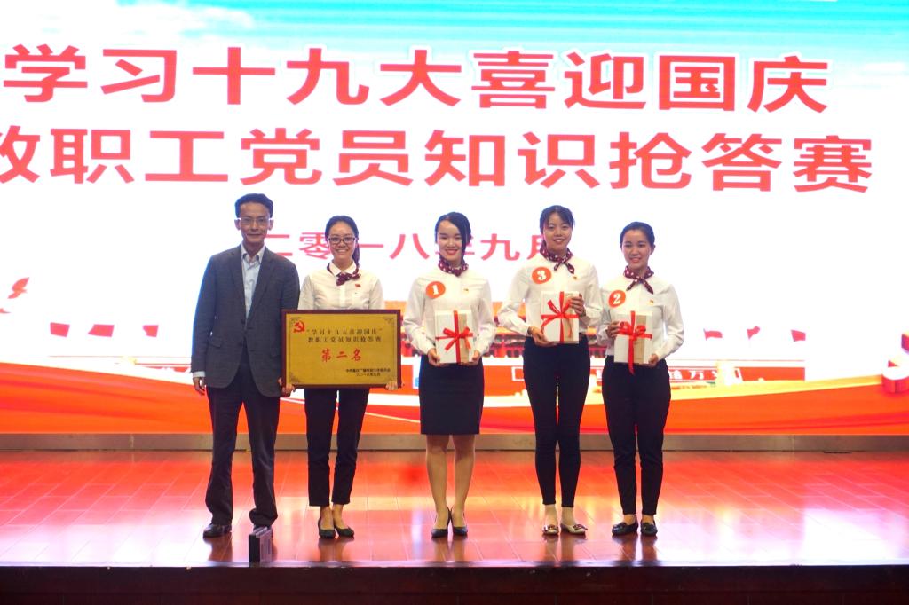 本次比赛分为初赛、复赛、决赛三个环节,初赛由各总支自行组织,选拔出的优秀队员组队代表总支参加复赛和决赛,通过现场复赛比拼,机关二总支代表队、管理学院党总支代表队、会计与金融学院党总支代表队、创新教育学院党总支代表队4支代表队进入决赛。通过现场决赛紧张激烈的角逐,会计与金融学院党总支代表队、管理学院党总支代表队、创新教育学院党总支代表队分获一、二、三名,其余9支参赛队获得优秀奖,并现场为获奖代表队颁发了奖牌和奖品。