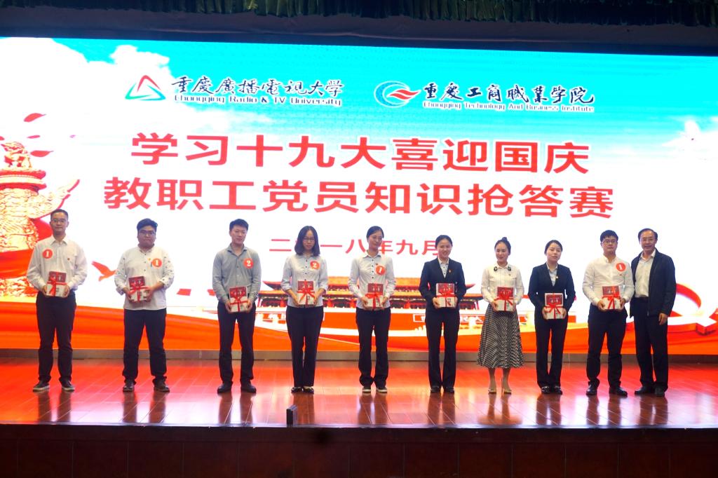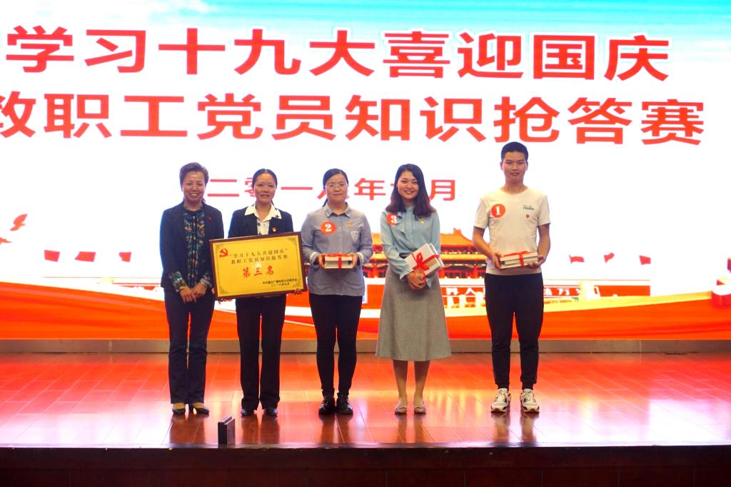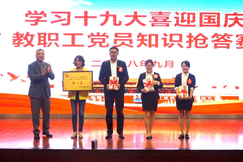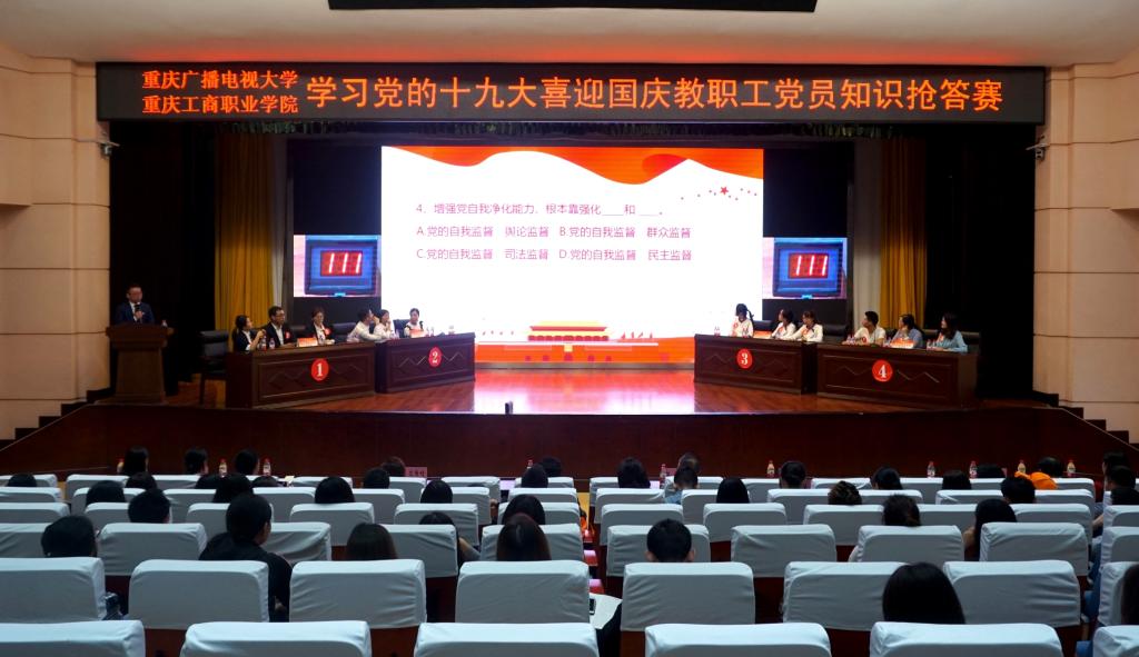 为深入学习贯彻习近平新时代中国特色社会主义思想和党的十九大精神,加强《宪法》《监察法》以及《纪律处分条例》(新修订)等党纪党规的学习,落实新时代全面从严治党要求,扎实推进学校党的建设和党风廉政建设工作,国庆前夕,“学习十九大喜迎国庆”教职工党员知识抢答赛在合川校区科学会堂举行。共有来自12个总支的参赛代表队和120余名教职工党员参加了此次活动,党委书记郭庆、校长李国、党委副书记周曦、纪委书记文传竹出席了活动。