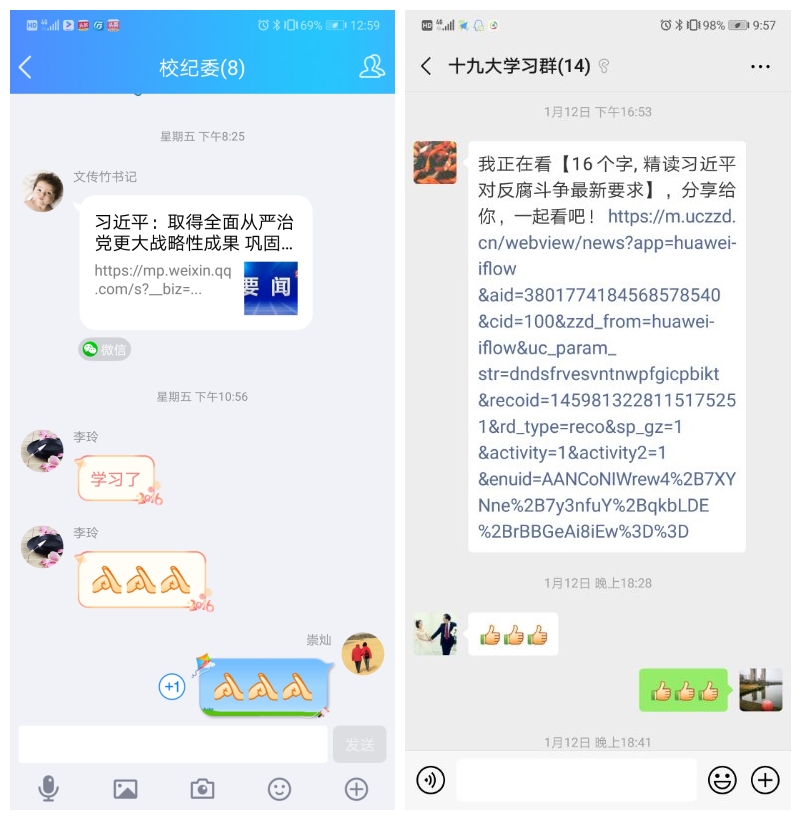 在此之前,校党委书记郭庆第一时间在领导干部学习群中转发了“16个字,精读习近平对反腐斗争最新要求”的学习材料,校纪委书记也第一时间在纪委委员群转发了学习材料,校领导班子和校纪委委员分别进行了在线学习。